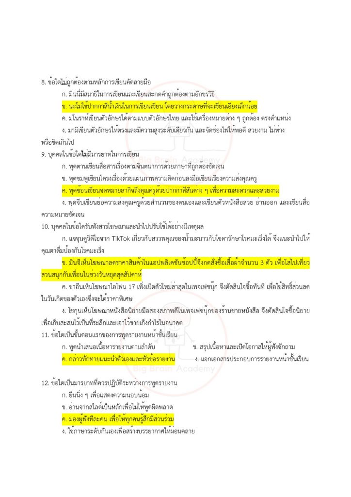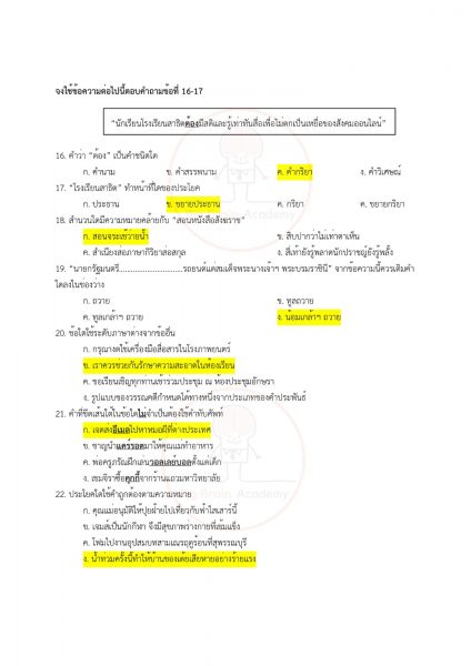 ภาษาไทยเน้นทั้งการอ่านจับใจความ การวิเคราะห์ความหมาย และความเข้าใจหลักภาษา ข้อสอบอาจมีบทความสั้น ๆ บทกลอน หรือข้อความให้ตีความ บางข้อจะวัดความเข้าใจเรื่องชนิดของคำ การใช้คำให้ถูกต้อง หรือการเรียงลำดับเหตุการณ์ วิชานี้ต้องอาศัยความละเอียดและความเข้าใจจริง ไม่ใช่อ่านผ่าน ๆ เพราะคำถามบางข้อจะซ่อนคำตอบไว้ในรายละเอียดเล็ก ๆ