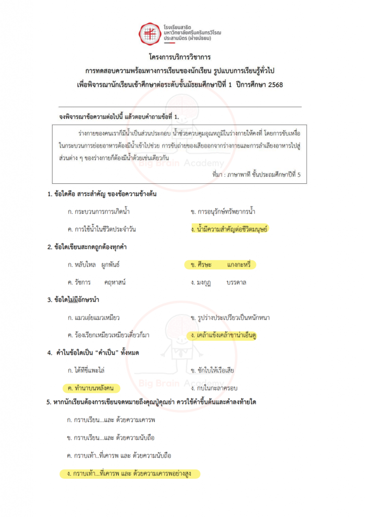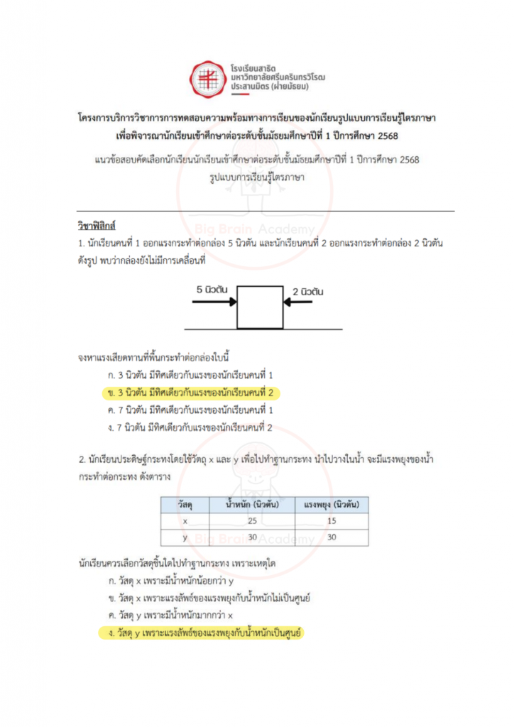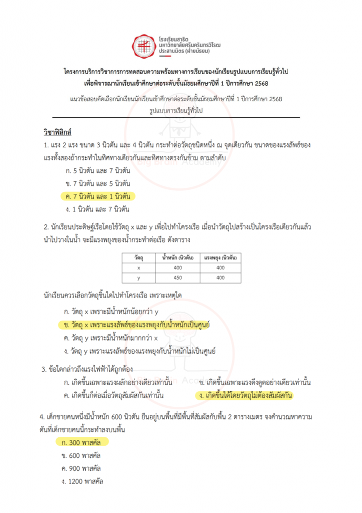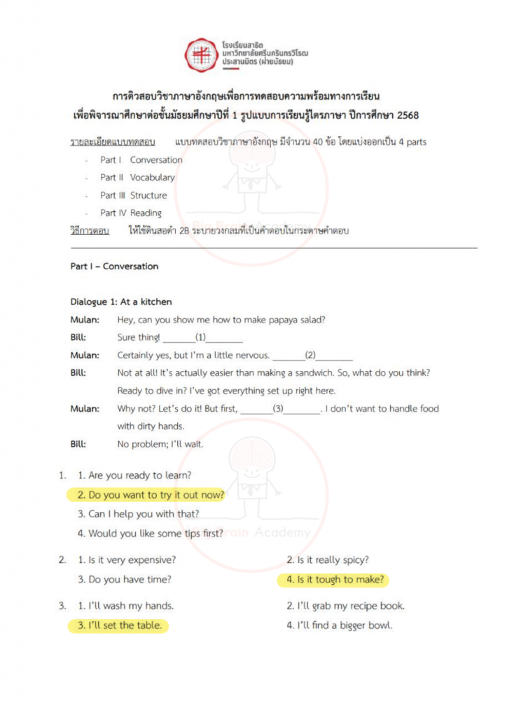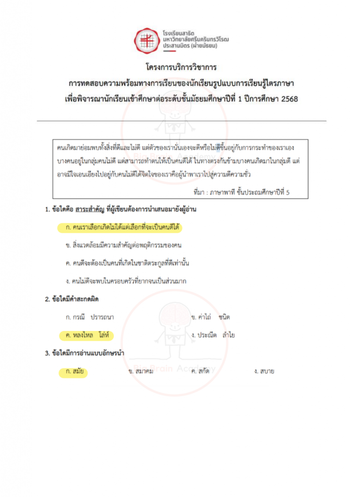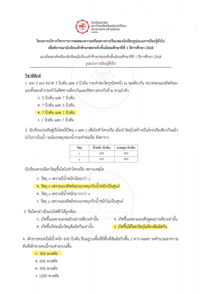 การได้เปิดดูตัวอย่างล่วงหน้า จะช่วยให้น้อง ๆ มองเห็นจังหวะของข้อสอบ เข้าใจว่าควรระวังจุดไหน และควรเตรียมตัวเสริมเรื่องใดเพิ่มเติม ไม่จำเป็นต้องทำให้ครบทุกข้อ หรือถูกทุกข้อ สิ่งสำคัญคือการสังเกตแนวคิด ฝึกอ่านโจทย์อย่างรอบคอบ และค่อย ๆ สร้างความคุ้นเคยกับรูปแบบข้อสอบ เมื่อถึงวันสอบจริง น้อง ๆ จะรู้สึกว่า “ไม่ใช่สิ่งที่ไม่เคยเห็นมาก่อน” และสามารถทำข้อสอบได้อย่างมั่นใจมากขึ้นค่ะ จากนี้ไป มาดูตัวอย่างของแต่ละวิชากันได้เลยค่ะ 📘✏️❤️