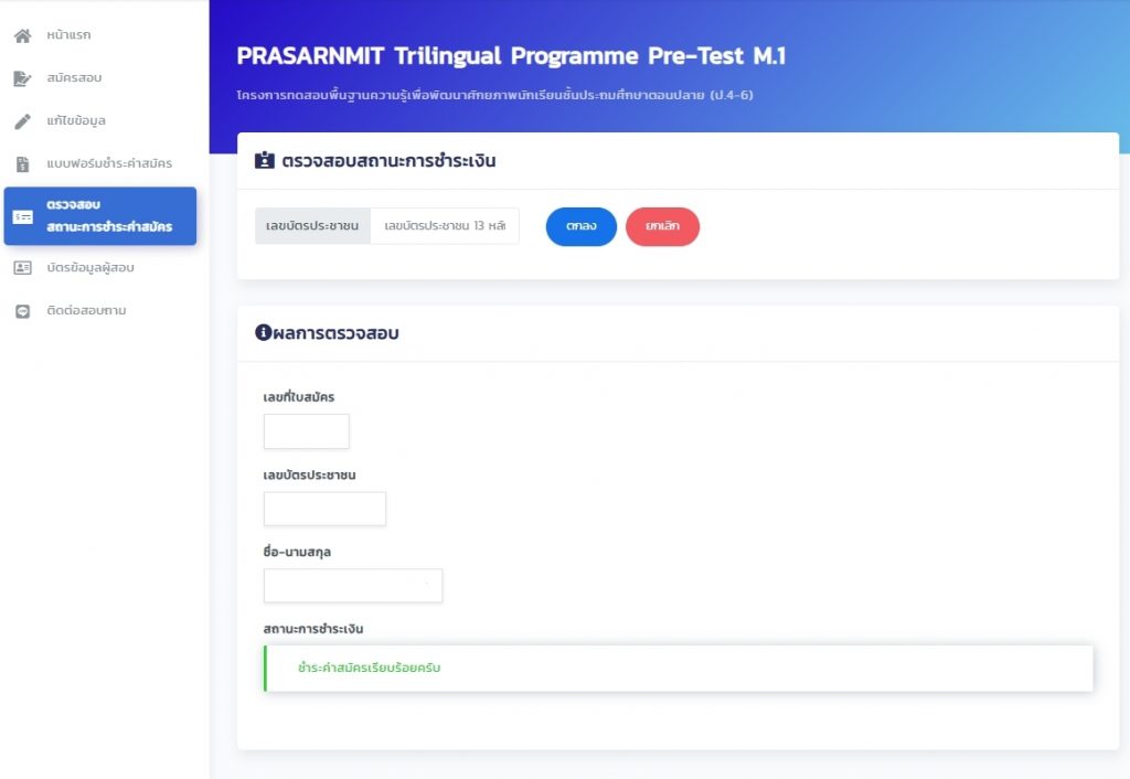 หากชำระเงินเสร็จแล้วสามารถตรวจสอบสถานะการชำระเงินได้ในวันถัดไป สามารถ Log-in เข้าสู่ระบบโดยใช้เลขบัตรประชาชน และวันเดือนปีเกิดของน้องได้เลย