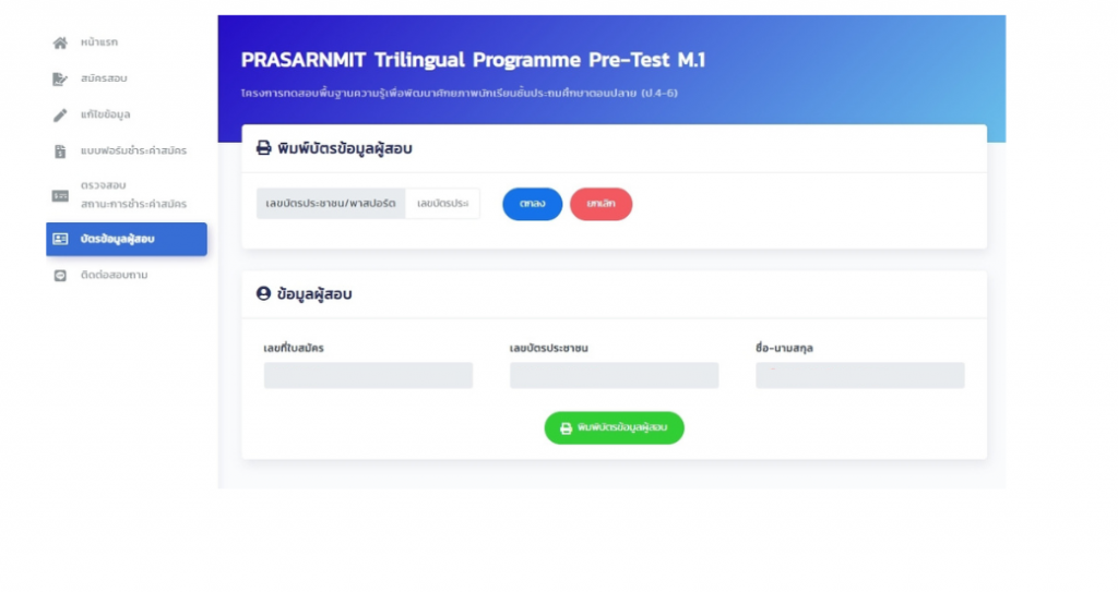 - กดปุ่ม “พิมพ์บัตรข้อมูลผู้สอบ” (ปุ่มสีเขียว)