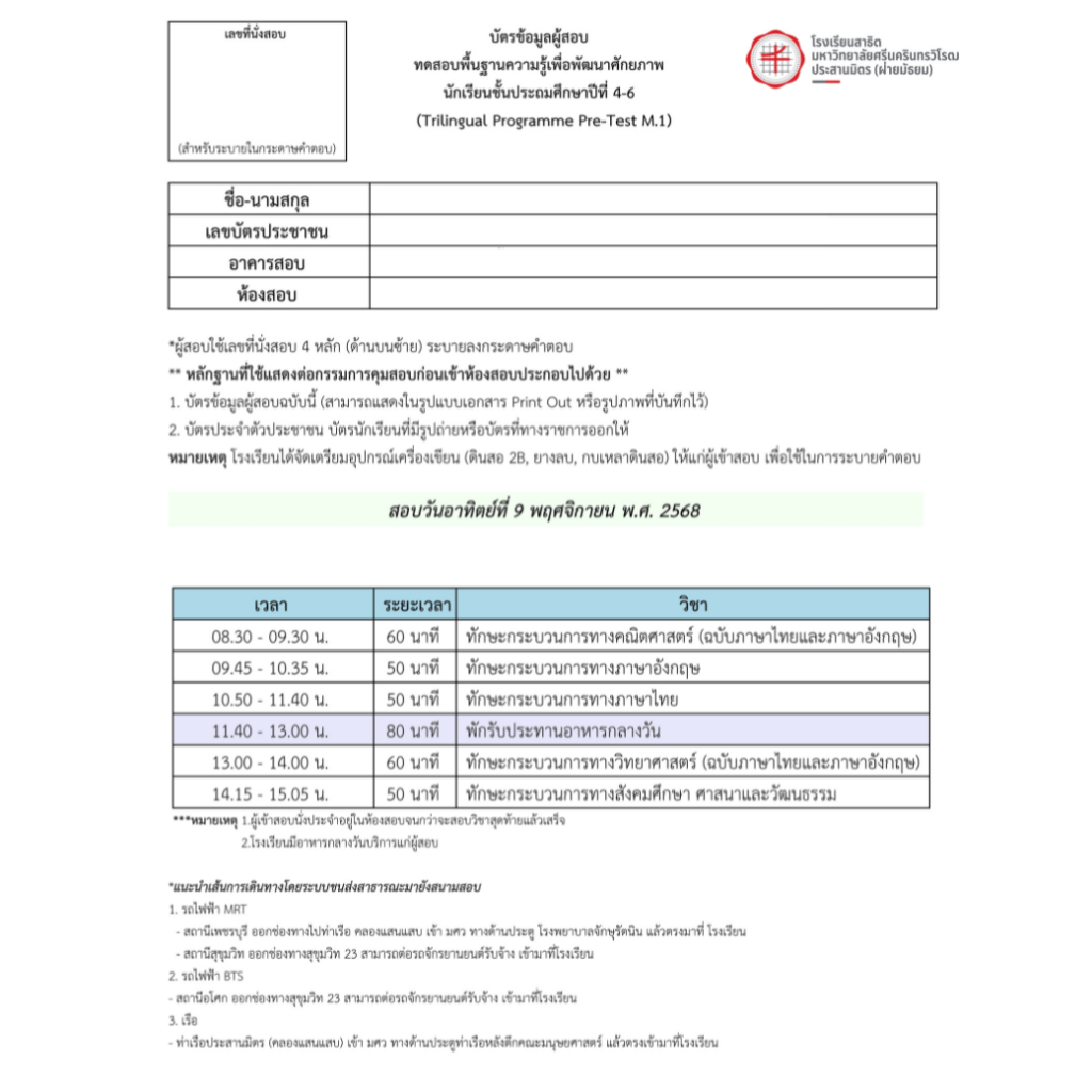 - ผู้ปกครองและนักเรียนต้องเตรียมหรือจัดหาอาหารกลางวันสำหรับผู้เข้าสอบเอง